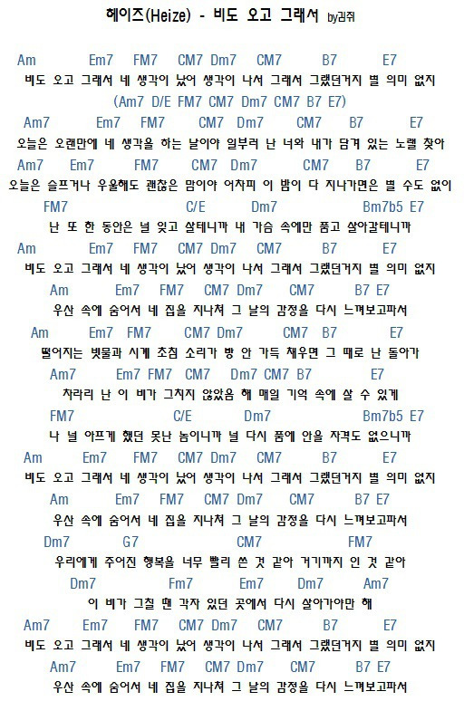 악보 게시판 헤이즈 Heize 비도 오고 그래서 By Bonu