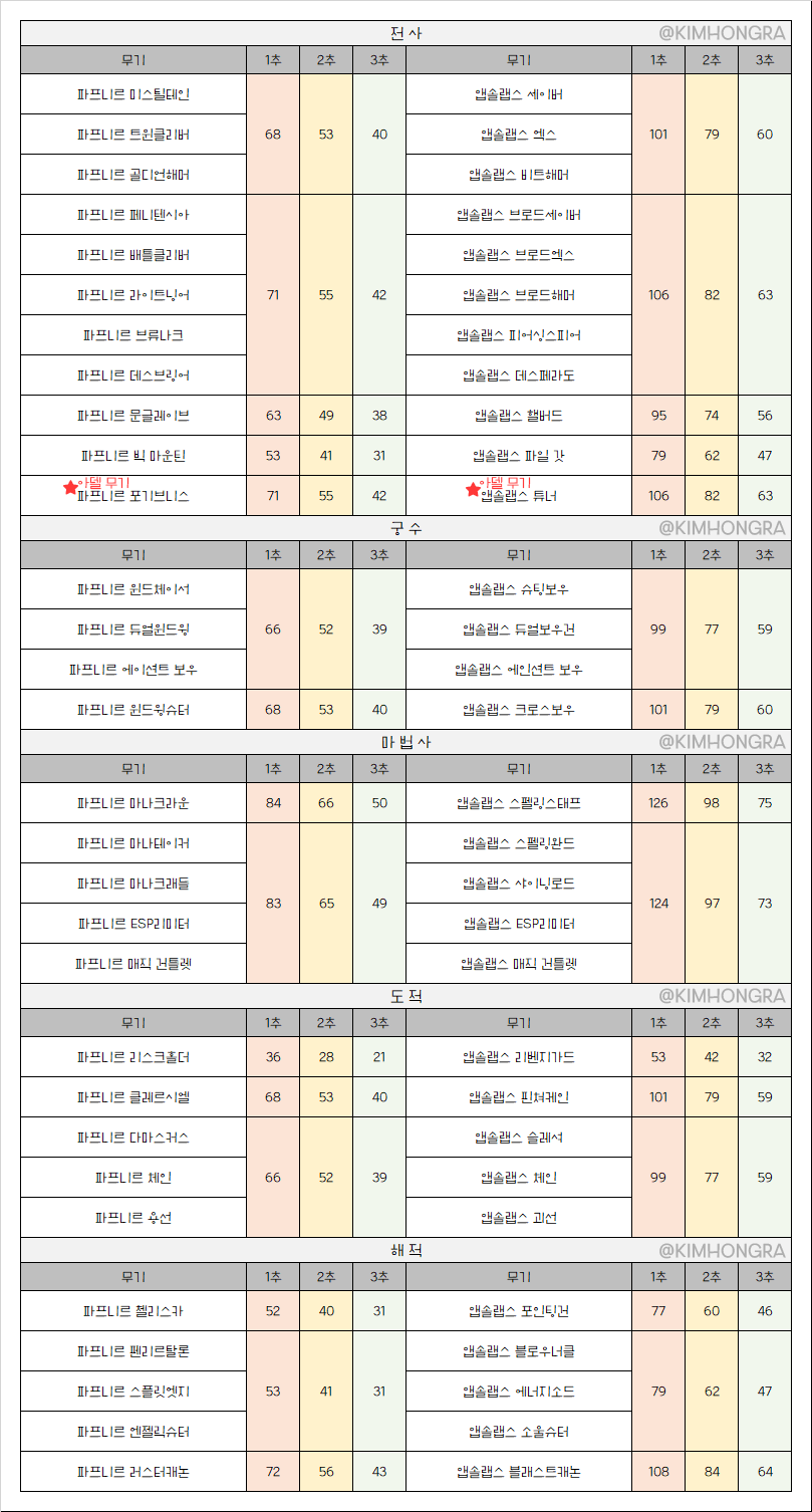 홍라네 공작소 ᴗ A Twitter 전직업 파프니르 앱솔랩스 무기 추옵 정리 1추 3추까지만 정리되어있습니다 아델 무기 추가로 재업로드