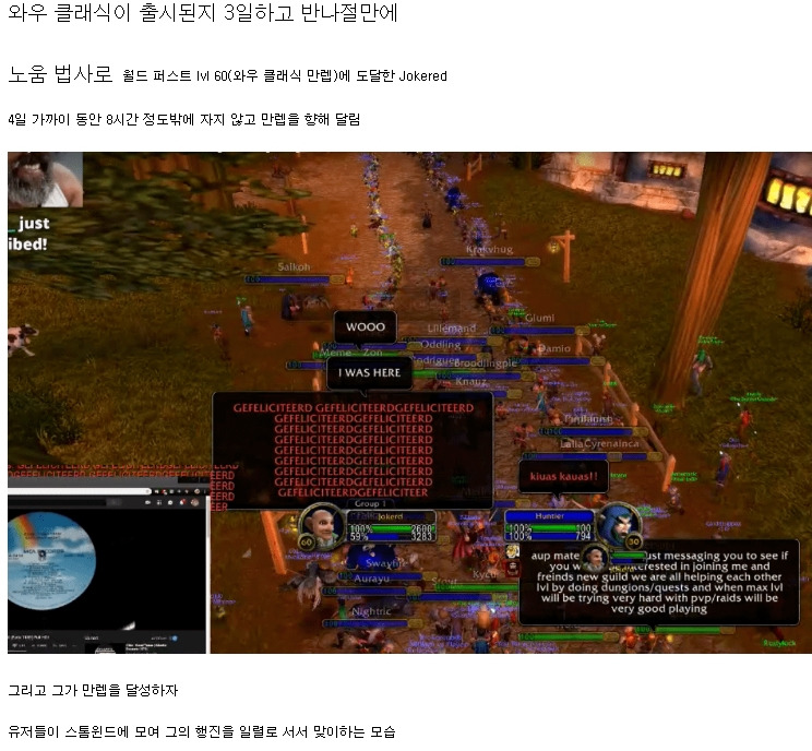 와우 클래식 첫 만렙 달성에 유저들 점프 퍼레이드