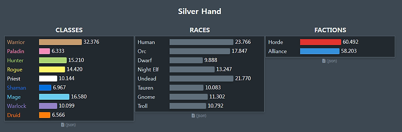 와우 클래식 직업 비율. 와우 서버 인구 비율 확인하기 0 2019 08 19. 와우 클래식 종족도 꽤나 많고 선택지가 넓어서. 진영인구 직업인구 전체인구 x 호드는 술사 냥꾼 얼라는 냥꾼 기사 출처. 소금평원 일반서버 호드 253명 얼라 776명로크홀라 전쟁서버 호드 4918명 얼라 5002명 한국 클래식 인구 인구조사 애드온인 censusplusclassic 을 통해 2019년 8월 27일 오후 2시부터 오후 5시까지 수집한 데이터 입니다.