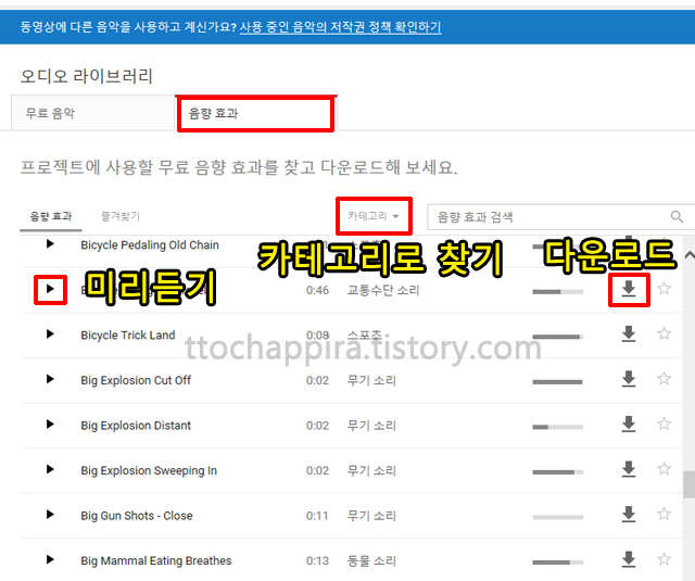 유투브 오디오 라이브러리로 효과음 다운로드하기