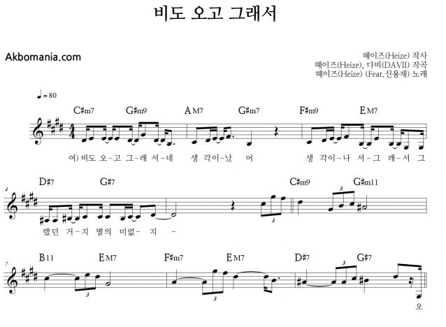 헤이즈 비도 오고 그래서 Feat 신용재 악보 악보바다