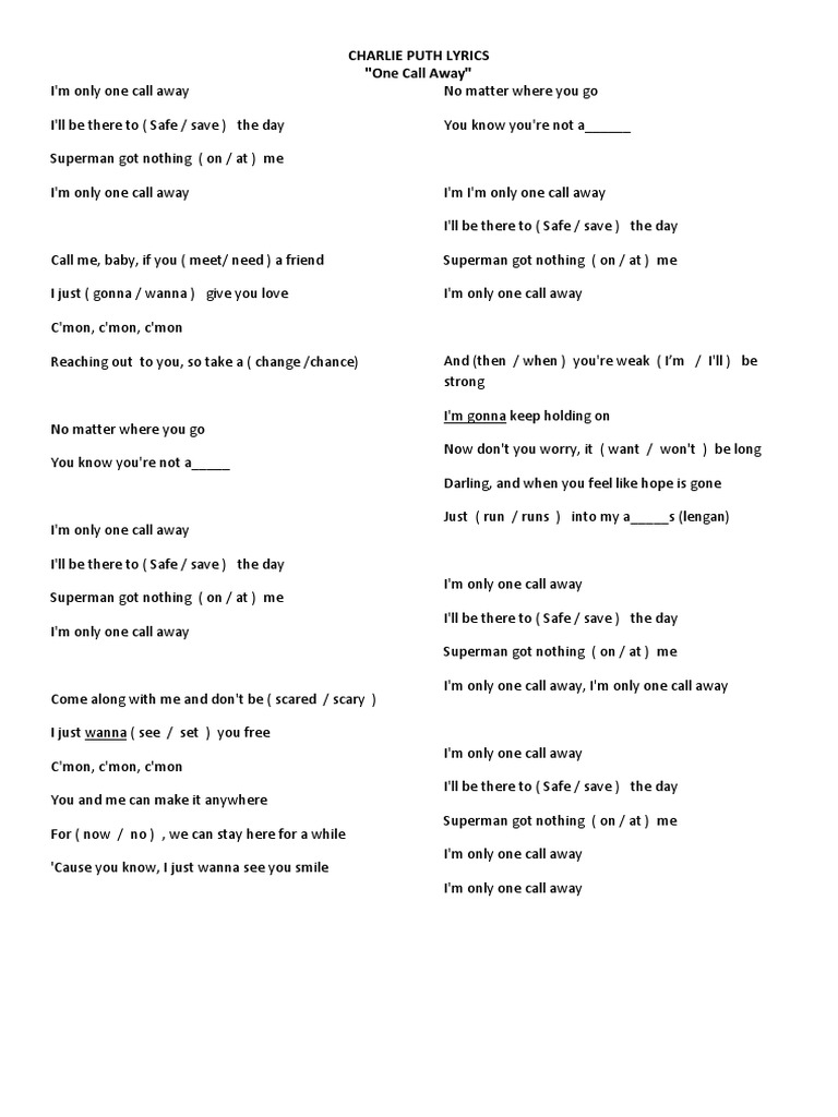 One Call Away By Charlie Puth Close Reading With Song Lyrics Grades 3 6